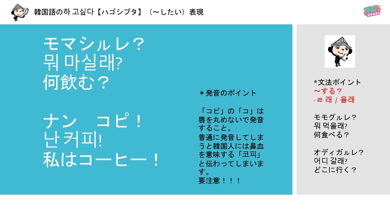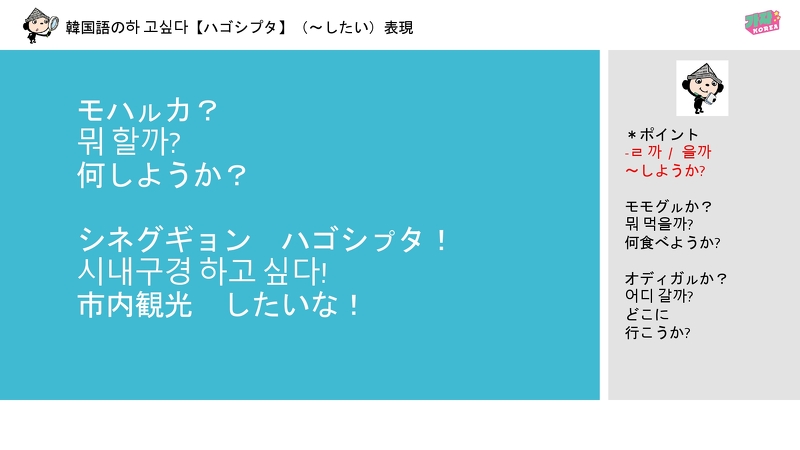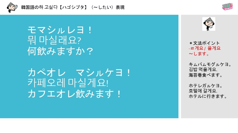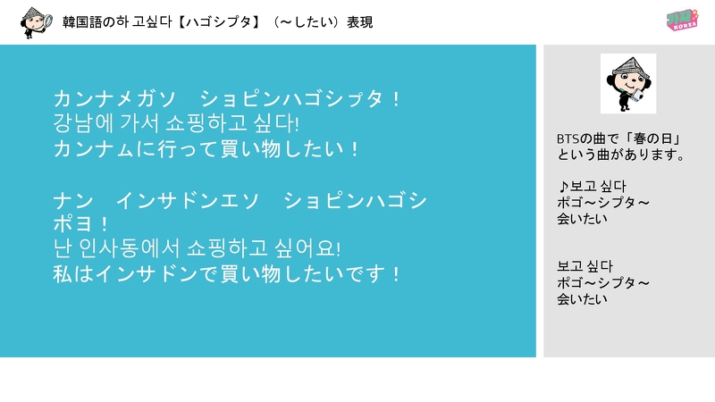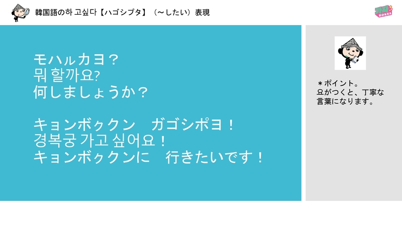 連載第3回は 하 고싶다【ハゴシプタ】(~したい)表現です。