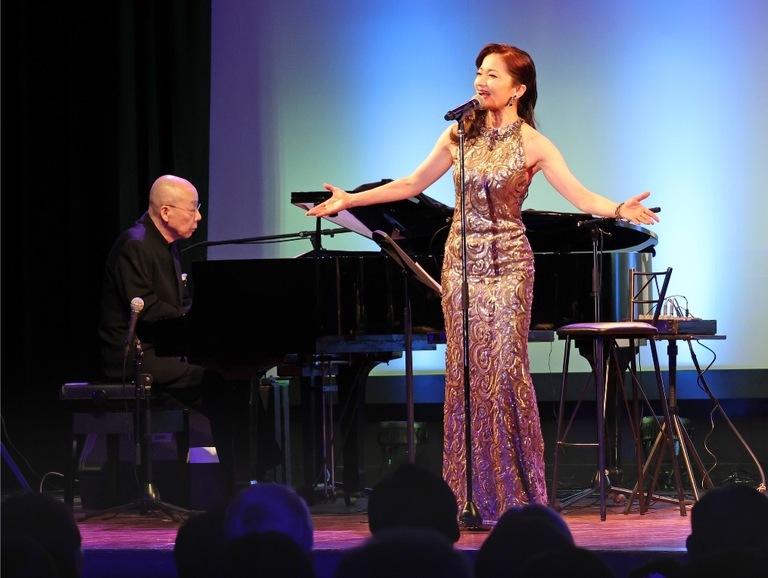 島田さんは島さんのピアノ演奏に合わせて、テレビドラマ「ホテル」の主題歌「約束」といった自身のヒット曲や、出演したミュージカル「レ・ミゼラブル」の曲などを歌い上げた。