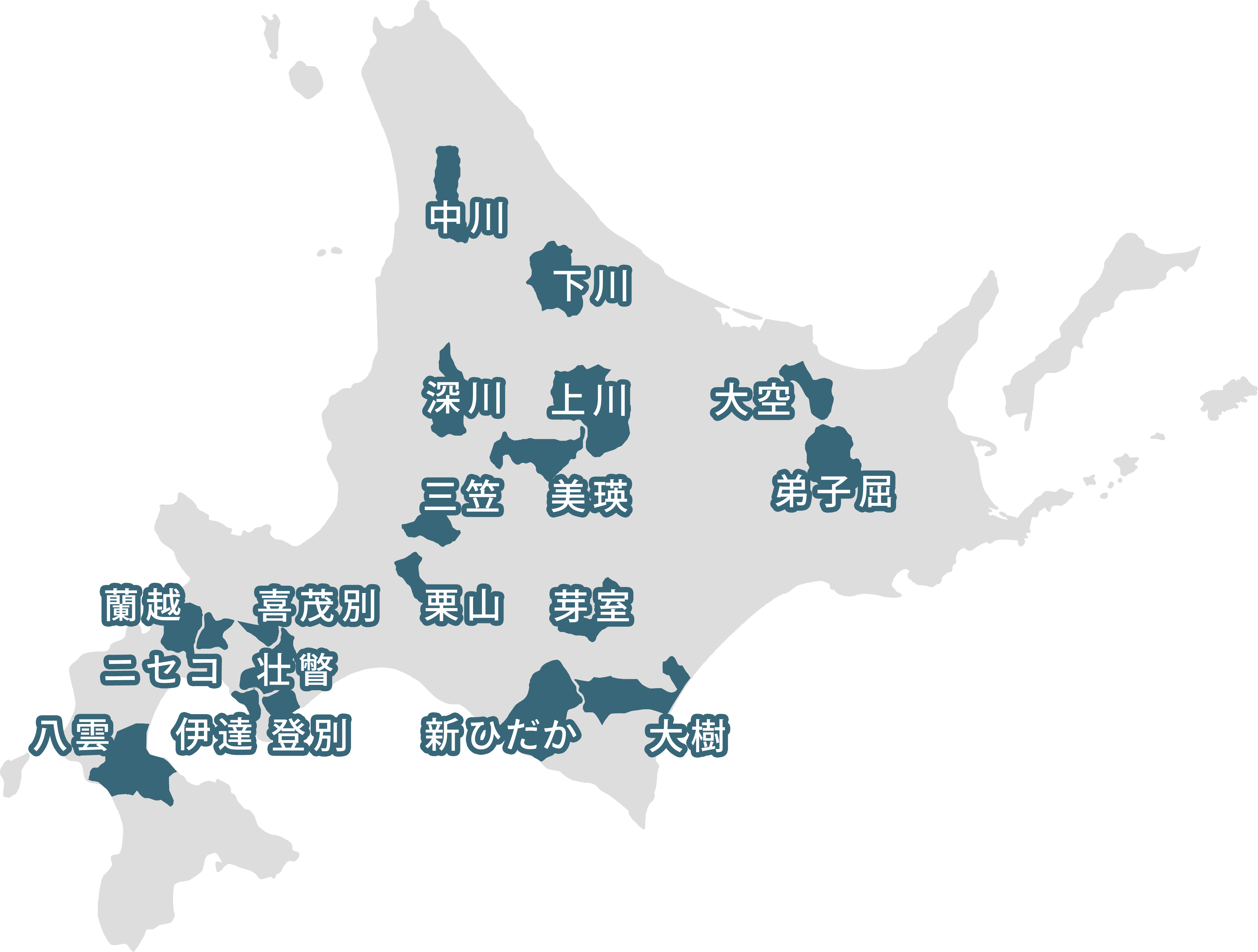 道央:喜茂別町・栗山町・新ひだか町・壮瞥町・伊達市・ニセコ町・登別市・深川市・三笠市・蘭越町