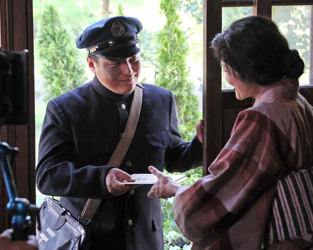 金田一、知里のやりとりイメージ*映画「カムイのうた」 記者が郵便配達役*東川で撮影*現場入り1時間、4回目でOK 北海道新聞社許諾D2303-2503-00026383 【東川】明治、大正期のアイヌ文化伝承者、知里幸恵(1903~22年)の生涯を題材にした町企画の映画「カムイのうた」の撮影が一段落した。7月上旬にクラ...